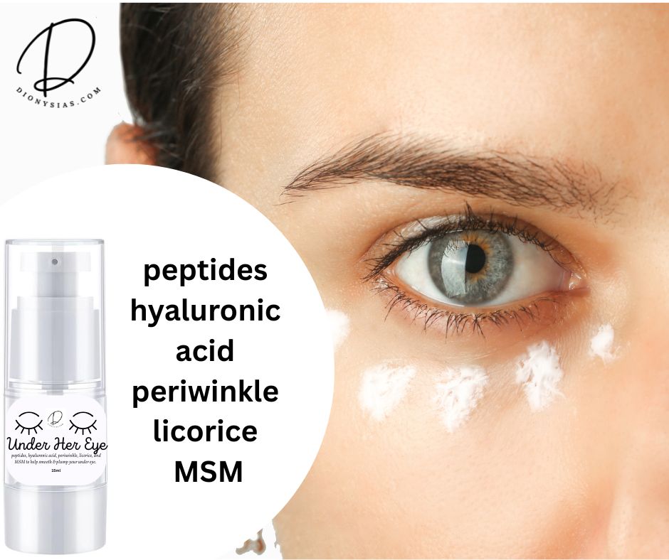 Peptides, hyaluronic acid, periwinkle, licorice, and MSM to help smooth & plump your under eye.