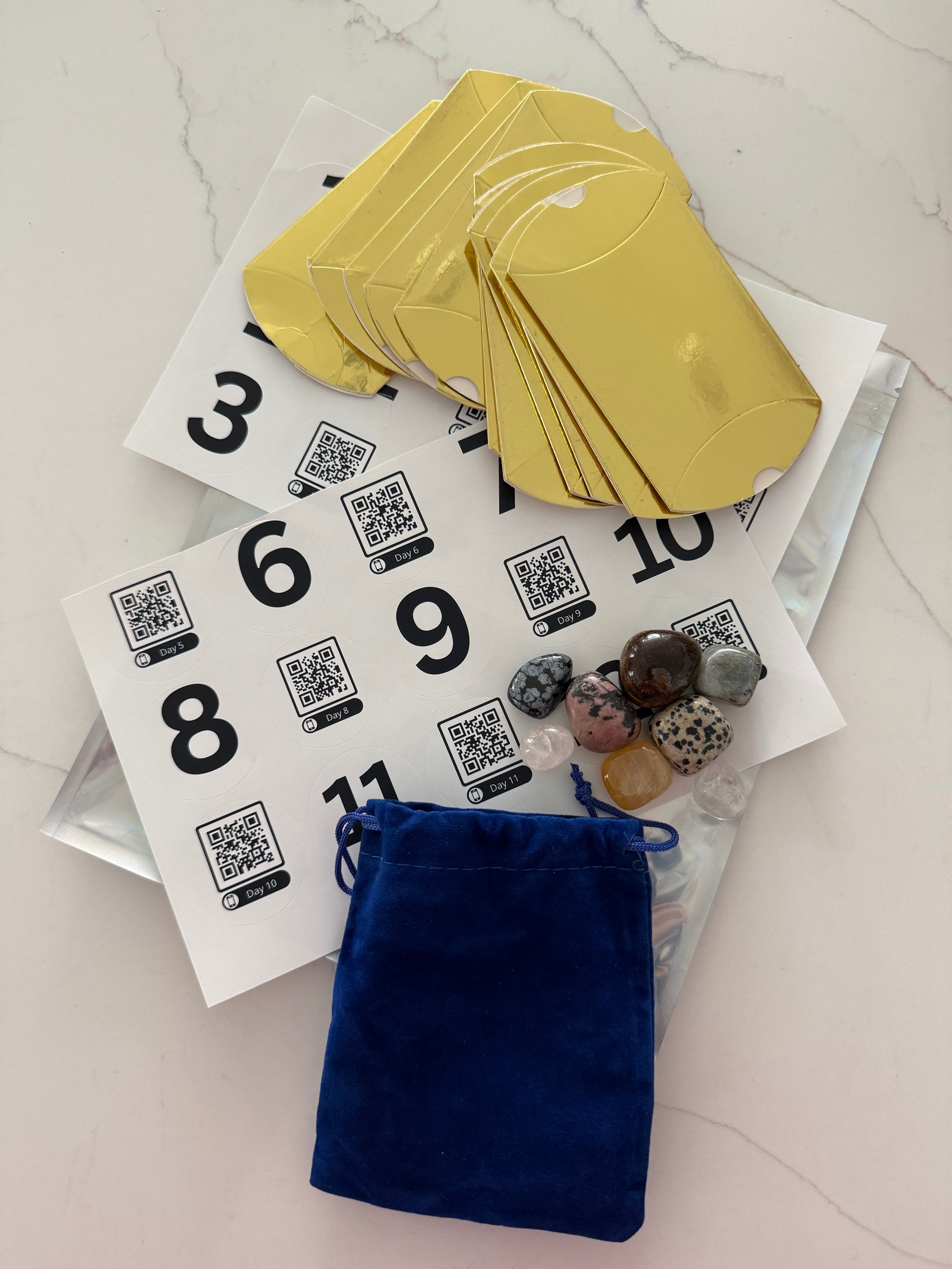 Simply match each stone to its label, slip it into a numbered pouch, and add the QR sticker. The recipient opens one pouch per day, scans the code, and uncovers the crystal’s story, symbolism, and energetic gift. It’s a meaningful and interactive way to share beauty, intention, and wonder throughout the holiday season.