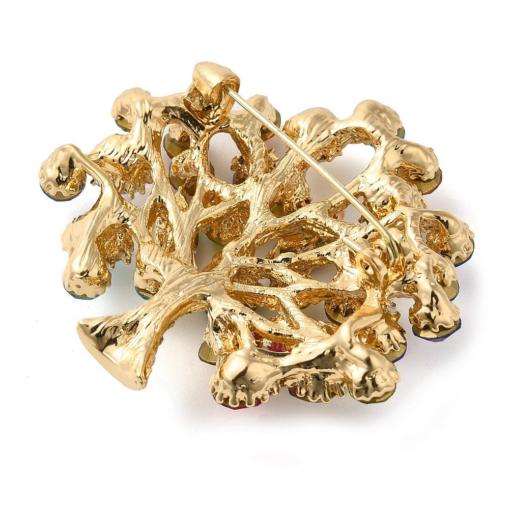 A vibrant gold Christmas tree brooch adorned with sparkling multicolor rhinestones. Perfect for holiday outfits, scarves, and gift giving.